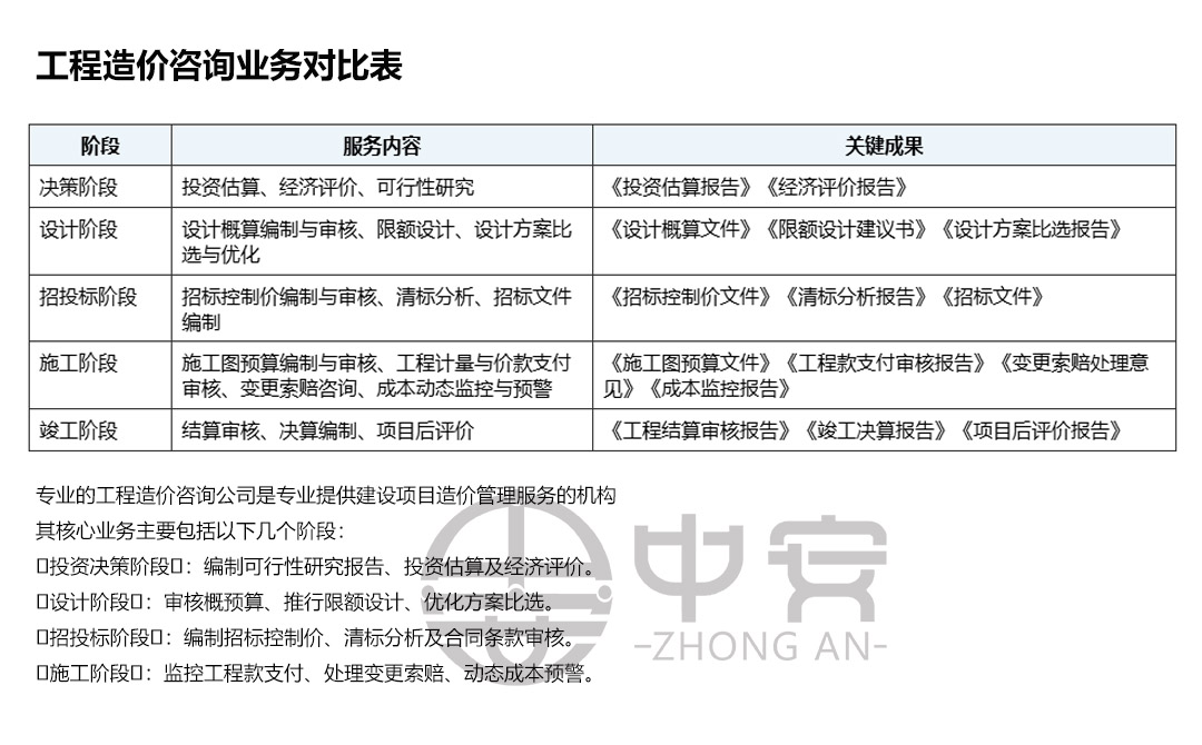 施工阶段 | 施工图预算编制与审核、工程计量与价款支付审核、变更索赔咨询、成本动态监控与预警 | 《施工图预算文件》《工程款支付审核报告》《变更索赔处理意见》《成本监控报告》 |